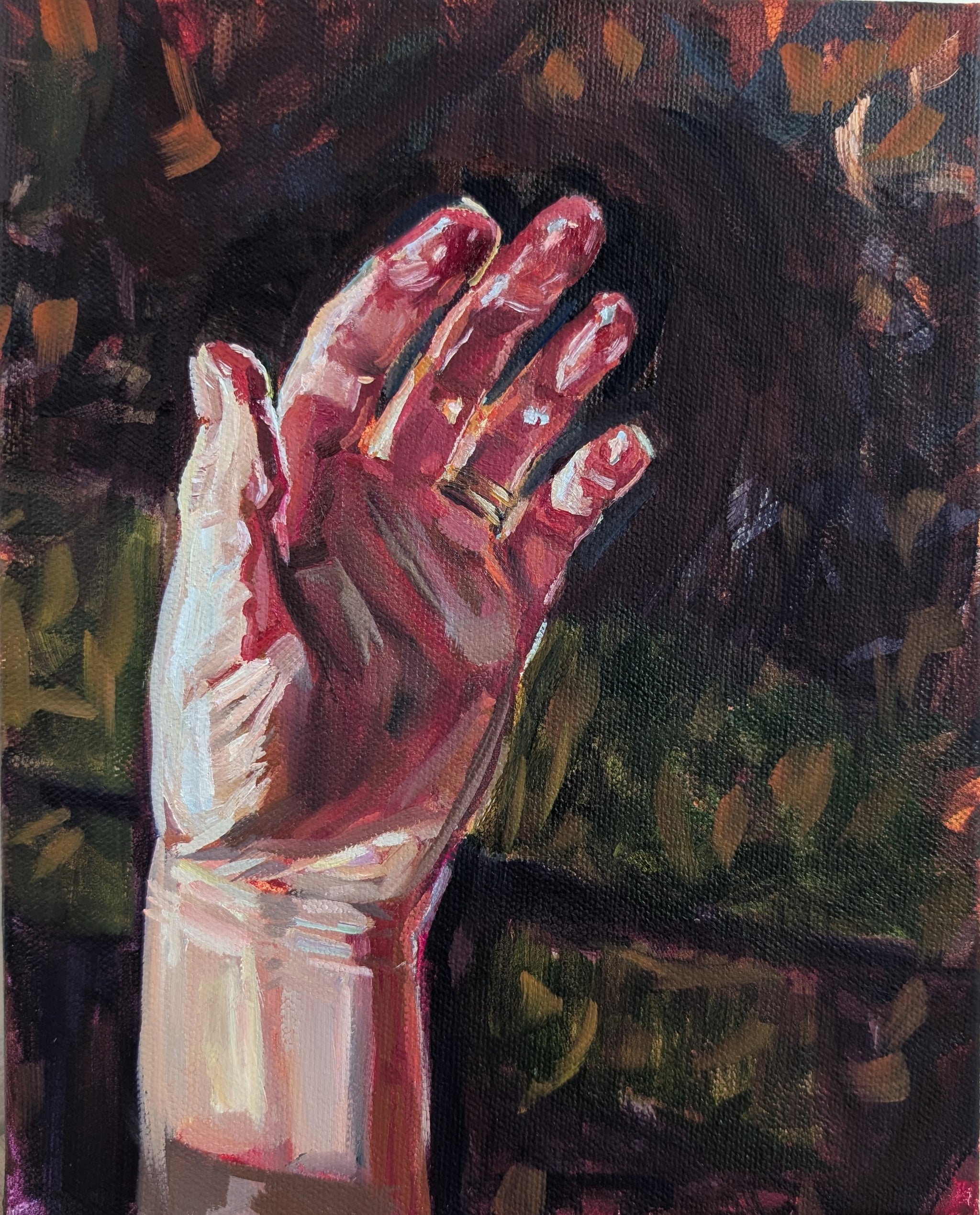 Description: A small hand study, painted as part of the series 'Rebirth', reflecting on aging, bodies, becoming and history. I love to paint the body, faces, and hands. One day in the studio I realized I had smeared red oil paint all over my hand, and in the sun it looked like fresh blood. Contemplating how frequently a woman might have blood on her hand through her lifetime for a number of common reasons, as well as blood stains, inspired me to paint this little study. Women have a unique relationship to blood, always connected to life.
